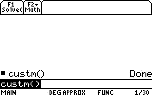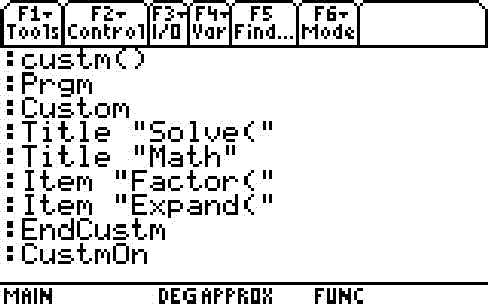 It is possible to create your own personal toolbar at the top of your TI-89 where you can place whatever programs and/or functions that you want for easy access. To create a tool bar, you must create a Custom...EndCustm, Control(F2):7, block. Each tab is a Title, I/O(F3):Dialog(1):7, and each item within the tab is an Item, I/O(F3):Dialog(1):8,.